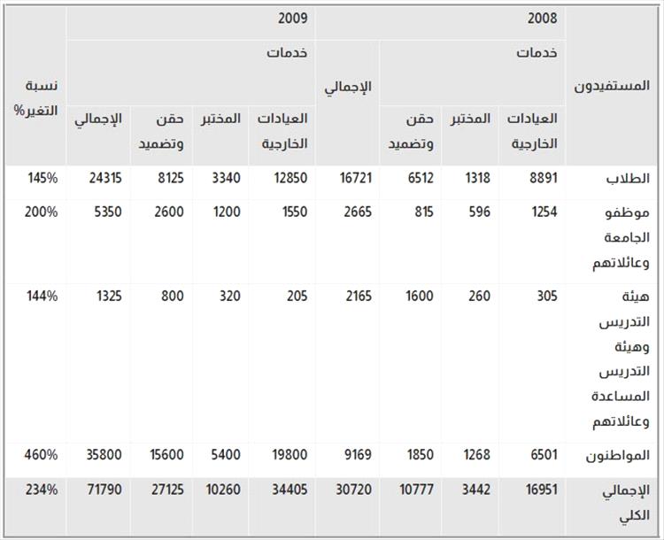 2) تقديم الخدمات الطبية بشقيها التشخيصي والعلاجي لأعضاء هيئة التدريس وموظفي الجامعة وعائلاتهم وذلك مقابل اشتراك سنوي رمزي ألف ريال( 1000 ريال ) لأعضاء هيئة التدريس، ثمانمائة ريال (800 ريال ) لموظفي الجامعة.