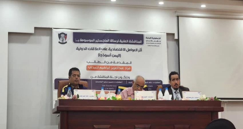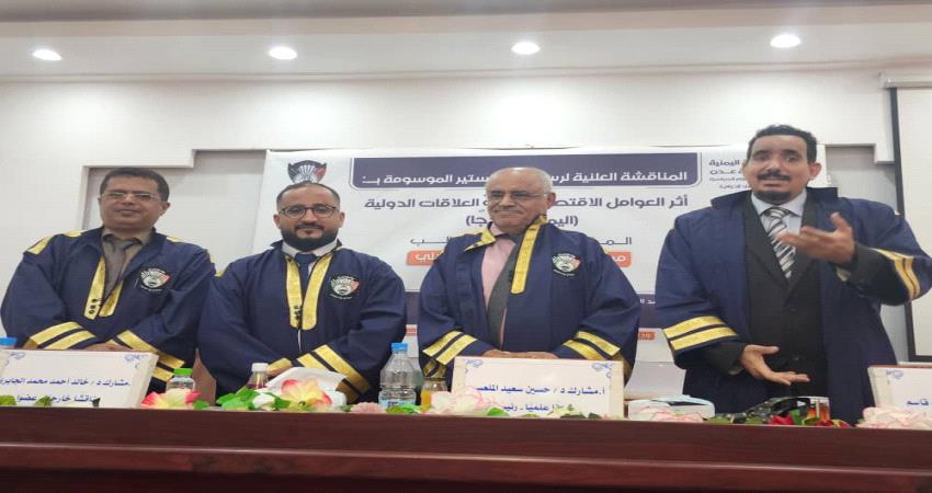 شهدت قاعة كلية الاقتصاد والعلوم السياسية - جامعة عدن بمدينة الشعب صباح يوم الاحد المناقشة العلنية لرسالة الماجستير للباحث مراد عبد العزيز إبراهيم العبدلي، والموسومة بـ:" إثر العوامل الاقتصادية على العلاقات الدولية – اليمن نموذجا "٠