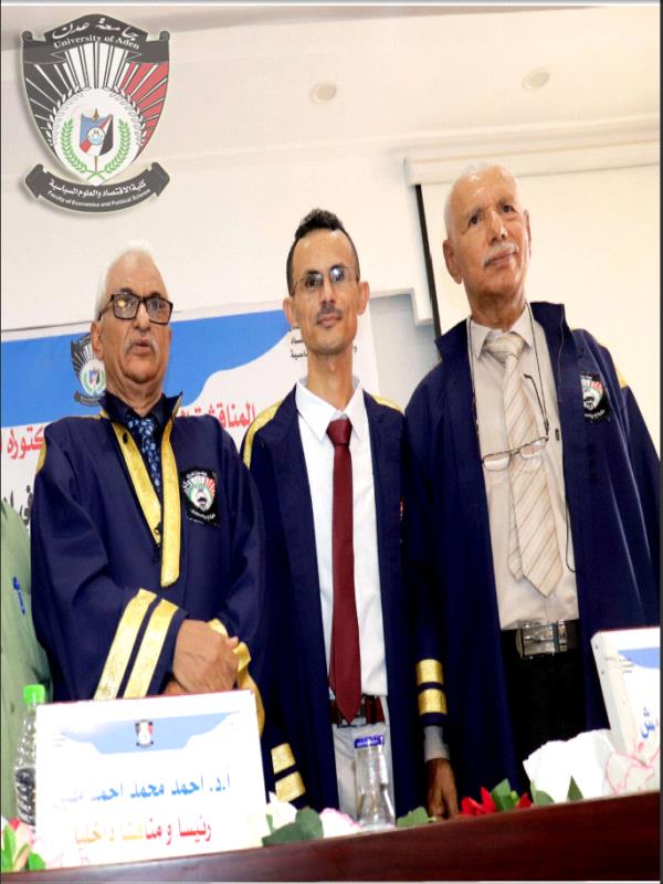 تمنح جامعة عدن ممثلة بكلية الاقتصاد والعلوم السياسية الباحث " محمد جمال مقبل ناصر " درجة الدكتورة بتقدير عام ممتاز مع مرتبة الشرف"