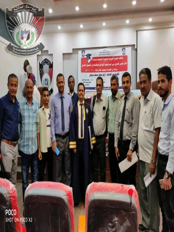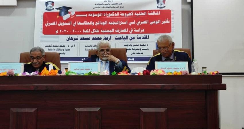 شهدت قاعة كلية الاقتصاد والعلوم السياسية - جامعة عدن بمدينة الشعب صباح يوم الإثنين 26 فبراير 2024م، بكلية الاقتصاد والعلوم السياسية بجامعة عدن مناقشة أطروحة الدكتوراه للباحث/ أرفق محمد مسعد شرهان عن رسالته الموسومة بــــــــــعنوان " تأثير الوعي المصرفي في استراتيجية الودائع وانعكاسها في التمويل المصرفي- دراسة تحليلية قياسية في المصارف اليمنية للفترة 2020-2000 ".