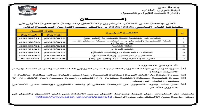 إعلاااان عن آخر موعد للتسجيل في كلية الحقوق جامعة عدن للعام 2025-2026م