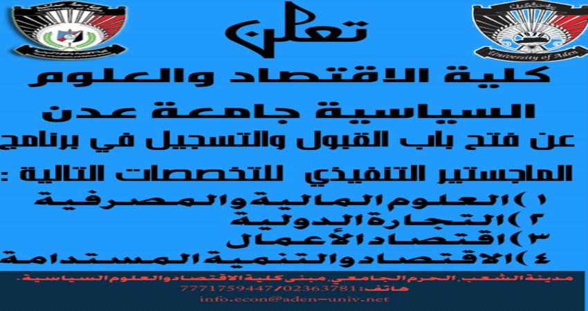 كليةالاقتصاد والعلوم السياسية – جامعة عدن، عن فتح باب القبول والتسجيل في برنامجالماجستير التنفيذي للتخصصات التالية: -